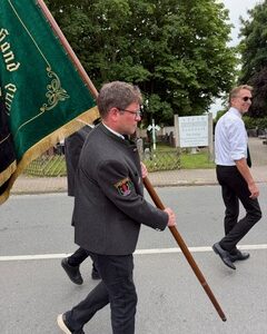 Mit einem Sternmarsch vom Schützenplatz zum Schützenhaus und wieder retour war das bei sengender Hitze schon eine Aufgabe für unseren Stefan Kolke 🙂 – Danke für das unermüdliche Tragen der Fahne.